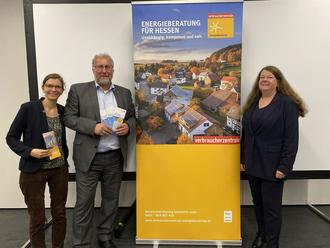 Klimaschutzmanagerin Ines Koch, Bürgermeister Manfred Ludewig und Dipl.-Ing. Eva Koch von der Verbraucherzentrale Hessen auf dem Infoabend.