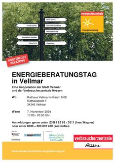 Für alle, die an weiterführenden Informationen und individuellen Beratungen interessiert sind, findet am 7. November 2024 im Rathaus der Stadt Vellmar ein Energieberatungstag statt. Interessierte können sich bei Klimaschutzmanagerin Ines Wagner unter der Telefonnummer 0561/82 92 – 3011 anmelden. (jb)