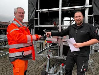 Schlüsselübergabe: Bauhofmitarbeiter Markus Castrop bekommt als zukünftiger Bühnenverantwortlicher der Stadt Vellmar die Schlüssel von Stagemobil-Mitarbeiter Johannes Laubert