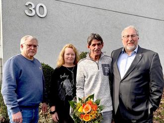 Blumen, Präsente und ein gemeinsames Abschiedsfoto v.l. Bauhofleiter Michael Eichel, Personalratsvorsitzende Heike Kratzsch, Siggi Geszner und Bürgermeister Manfred Ludewig