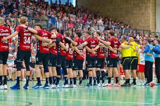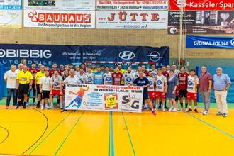 Handball-Spitzensport in Vellmar. Das traditionelle Teamfoto mit den Gästen aus Flensburg. (Foto: D. Krug)