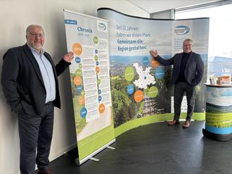 Bürgermeister Manfred Ludewig und Verbandsdirektor Dirk Stochla präsentieren die Wanderausstellung "50 Jahre Zweckverband Raum Kassel".