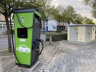 Der Energieversorger EAM installierte Anfang April den ersten „Hypercharger“ auf dem Parkplatz an der „Regenbogenkreuzung“ im Stadtteil Obervellmar.