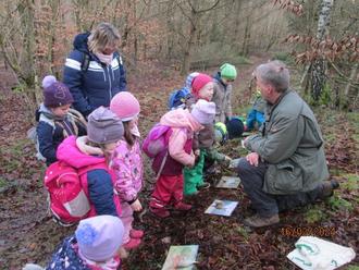 Zur Begrüßung schauten sie sich Fussspuren von Tieren, gefertigt in Salzteig, an. Auf dem Weg zur Lichtung fanden die Kinder zuerst einmal Hufabdrücke. Diese hatte jeder schon einmal gesehen. Auf der Lichtung spielten sie ein Spiel zum Thema „Futtersuche im Winter“. Ein Kind war der Fuchs, die anderen Kinder waren die Mäuse. Ausserdem gab es Schalen mit Haselnüssen. Die Mäuse mussten ganz schnell sich eine Nuss nehmen und vor dem Fuchs davonlaufen. Dieser musste die Mäuse fangen, da er ja auch Hunger hatte. Nach dem Spiel ging die Spurensuche weiter. Schnell fanden die Kinder Fussabdrücke von Rehen, Füchsen und anderen Tieren. Außerdem fanden sie Fellstücke, Hauer, Geweihe und ähnliche Sachen. Diese mussten sie dann dem richtigen Tier zuordnen. Danach wurde erst einmal am „Hochstein“ eine Frühstückspause eingelegt. Nach der Stärkung ging es wieder in den Wald. Ranger Markus „unterhielt“ sich zwischendurch mit einem balzenden Specht. Es folgte ein Experiment zum Thema: Wie halten die Tiere sich am besten warm im Winter. Dazu hatte der Ranger warmes Wasser, kleine Becher und ein Thermometer mitgebracht. Die Kinder sollten die mit Wasser gefüllten Becher im Wald verstecken. Nach einer ganzen Weile holten sie sie wieder heraus und es wurde die Temperatur gemessen. Am wärmsten war das Wasser der Becher, welche ganz nah aneinander gestellt wurden waren. Das bedeutete also, dass die Tiere im Winter, sich durch Aneinanderkuscheln, am wärmsten halten können.