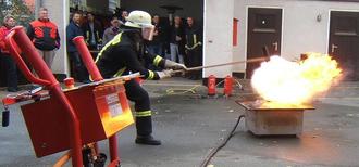 Unser Gruppenfoto zeigt die Feuerwehrfrau Fiona Fransaert zusammen mit Bürgermeister Kalhöfer, Christoph Fisseler, Christian Döhler sowie die beiden Gemeindebrandinspektoren Heiko Schäl und Marco Amert. Aus dem Jahr 2006 stammt die Aufnahme der eindrucksvollen Übungs-Löschung eines Fettbrandes auf dem Hof des Gerätehauses.