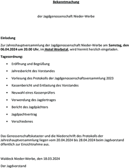 Einladung zur Jahreshauptversammlung der Jagdgenossenschaft Nieder-Werbe am Samstag, den 06.04.2024 um 20.00 Uhr, im Hotel Werbetal, wird hiermit herzlich eingeladen.