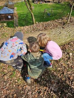 Passend zum Frühlingsanfang hat die Sonne uns ihre volle Kraft geschenkt. Gleich nach dem Frühstück machten wir uns auf den Weg zu einem unserer Waldstücke. Die Kinder schnappten sich Lupen und Ferngläser auf der Suche nach den ersten Tieren. Tatsächlich entdeckten sie Marienkäfer, Schmetterlinge und ganz viele Kröten und Frösche die gerade „Hochzeit feierten“. Demnächst können wir dann die kleinen Kaulquappen bestaunen und im Sommer die zig kleinen Kröten und Frösche herumhüpfen sehen. Andere kletterten am Hang hoch und runter und wieder andere suchten sich Stöcke zum Schnitzen.