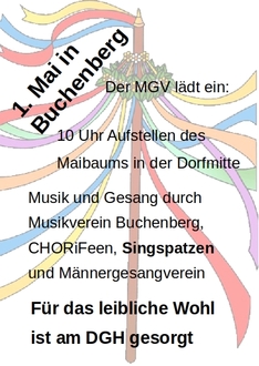 Das traditionelle Maibaumaufstellen durch die Dorfjugend Buchenberg findet wieder am 1. Mai um 10 Uhr in der Ortsmitte statt. Vorher treffen sich alle am neuen Feuerwehrhaus am Rabenköppel um von dort mit dem Baum zur Ortsmitte zu ziehen. Wenn der Baum steht wird der Mai am DGH gefeiert. Der Musikverein wird spielen und die Buchenberger Sängerinnen und Sänger, inklusive der Kinder, werden Kostproben ihres Könnens zum Besten geben. Der Männergesangverein freut sich über zahlreiche Gäste aus nah und fern.