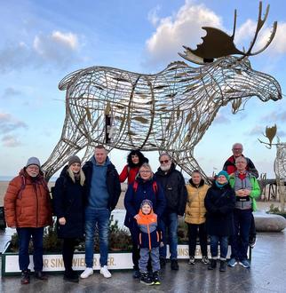 Die Bilder zeigen einen Teil der Reisegruppe vor dem gewaltigen Elch am Strand von Travemünde an einem zunächst etwas trüben Tag und später bei Sonnenschein Besucher vor dem imposanten, einzigartigen Holstentor.