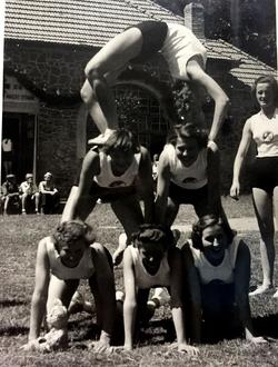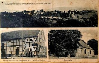 Unsere beiden Bilder zeigen fröhliche Turnmädchen im Jahr 1951 „beim Bau einer lustigen Pyramide“ sowie eine Ansichtskarte aus Marienhagen mit verschiedenen Motiven, so auch mit der „Geburtstags-Halle“ in ihrer Jugendzeit.