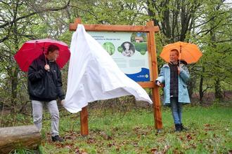 Höhepunkt: Freudig enthüllten die Schülerinnen und Schüler die neue Infotafel an der Bathildishütte im Nationalpark Kellerwald-Edersee.