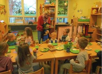 Am Mittwoch, den 24. April 2025, besuchte uns das Team rund um Frau Dr. Otto aus der Zahnarztpraxis „Krümmelbein“ aus Frankenberg. Sie hatten einen besonderen Gast mitgebracht, und zwar die „Hexe Irma“. Frau Otto ging mit der Hexe von Gruppe zu Gruppe. Dort wurde über gesunde Zähne, gesundes Frühstück und das Zähneputzen gesprochen. Das zahnaktive Kauen („die Zähne machen Sport“) durch Körnerbrot und festes Gemüse ist besonders wichtig für Kitakinder. Natürlich darf am Nachmittag auch genascht werden; alles in einem gesunden Rahmen. Das Allerwichtigste ist dann natürlich das abendliche Zähne putzen mit Hilfe der Eltern. Kitakinder sind in ihrer Entwicklung noch nicht dazu in der Lage, die Zähne richtig sauber zu putzen. Erst ab dem 8.Lebensjahr ist die Handmotorik so weit ausgereift, dass sie alleine Zähne putzen können. Nach dem Gespräch bekamen die Kinder ein wunderbar leckeres und gesundes Frühstück von den Zahnarzthelferinnen gereicht. Allen schmeckte es vorzüglich und wurde nahezu restlos verputzt. Danach putzte das Zahnarztteam mit den Kindern nach der KAI-Methode (Kauflächen; Außenflächen; Innenflächen) die Zähne. Dazu wurde das Zahnputzlied „Zahnbürste tanz in meinem Mund“ gesungen, welches die Kinder vom täglichen Zähneputzen in der Kita kennen. Zur Belohnung bekam jeder einen Aufkleber mit „Hexe Irma“ darauf.