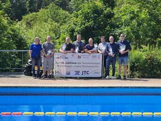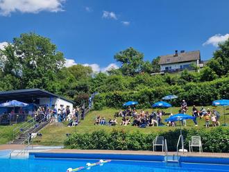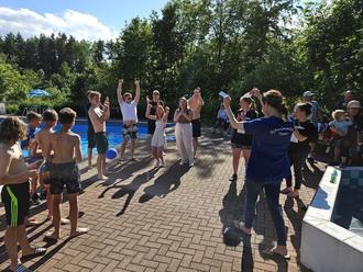 Um 14.30 Uhr begann das „Spiel ohne Grenzen für Jedermann“. Angemeldet hatten sich insgesamt fünf Teams. Absolviert werden mussten jeweils fünf verschiedene Spiele an unterschiedlichen Stationen. Dazu zählten u.a. die Wasserrutsche, das Bierpong, das Unterwasserpuzzle sowie die Gummibootstaffel. Alle Spiele mussten natürlich in kürzester Zeit von den Teams im oder am Schwimmbecken bewältigt werden.