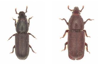 Indikator für ursprüngliche Wälder: Mit dem Breitkrempigen Baumhöhlenrüssler (rechts) und dem Plastischen Baumhöhlenrüssler (links) wurden insgesamt bislang 36 Urwaldreliktarten im Nationalpark Kellerwald-Edersee nachgewiesen. Sie sind Zeugen für die besonderen Urwaldstrukturen im Schutzgebiet. Der Nationalpark gilt als bundesweiter Urwaldkäfer-Hotspot.