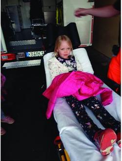 Weiter ging es nach draußen, dort wartete schon der Rettungswagen auf uns. Dort zeigte uns der Rettungssanitäter wie man auf der Liege angeschnallt wird und was es alles für verschiedene Geräte im Rettungswagen gibt.