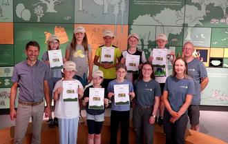 In der KellerwaldUhr: Die Junior Ranger der Kellerwaldschule Frankenau freuen sich über ihre Zertifizierung - Nationalparkleiter Manuel Schweiger (1.v.l.) überreichte mit den betreuenden Nationalpark-Rangern Alisa Fischer (4.v.r.), Anne Wöllenstein (2.v.r.) und Volker Nagel (1.v.r.) den Kindern ihre Urkunden.