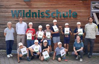 Vor der WildnisSchule: Nationalparkleiter Manuel Schweiger (2.v.l) ernannte mit Sven Polchow (1.v.r), Teamleiter Bildung und der betreuenden Rangerin Alisa Fischer (3.v.r) die Viertklässler der Grundschule Edertal offiziell zu Junior Ranger. Die Kinder freuen sich gemeinsam mit Schulleiterin Dörte Grell (1.v.l) über ihre Auszeichnung.