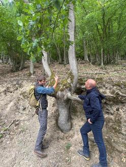 Staatsminister Ingmar Jung staunt über die bizarren Wuchsformen der Eichen an der „Kahlen Hardt“ entlang des Urwaldsteigs, den er während seiner Sommertour mit Nationalparkleiter Manuel Schweiger (links im Bild) am Sonntag stückweise wanderte. Bildautor: Hessisches Ministerium für Landwirtschaft und Umwelt, Weinbau, Forsten, Jagd und Heimat (HMLU)/ Olaf Streubig