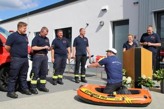 Die feierliche Schlüsselübergabe an die neuen Wehrführer Lukas Markolf und Jan Schäfer erfolgte durch die Vereinsvorsitzenden Nicole Koppe und Johannes Hamel. Mit im Gepäck: Maskottchen „Grisu“, ein kleiner Drache, der künftig als Glücksbringer im MTW mitfährt. „Möge er euch immer wieder heil nach Hause bringen“, lautete der Wunsch des Vorstandes.