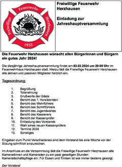 Die diesjährige Jahreshauptversammlung findet am 03.02.2024 um 20.00 Uhr im Feuerwehrhaus Herzhausen statt. Hierzu lädt die Freiwillige Feuerwehr Herzhausen alle aktiven und passiven Mitglieder herzlich ein.