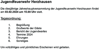 Die diesjährige Jahreshauptversammlung der Jugendfeuerwehr Herzhausen findet am 03.02.2024 um 15.00 Uhr statt.