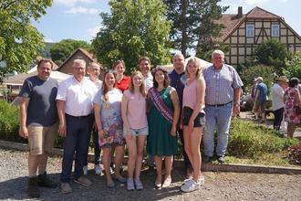 Gruppenbild mit Heideblütenpinzessin v.l.n.r.: Frederik Westmeier (Bürgermeister Nationalparkgemeinde Edertal), Rainer Hesse (Kreistagsvorsitzender Waldeck-Frankenberg), hintere Reihe: Karsten Kalhöfer (Bürgermeister Nationalparkgemeinde Vöhl), Kristin Gampfer (Geschäftsführerin Naturpark Kellerwald-Edersee), Manuel Schweiger (Leiter Nationalpark Kellerwald- Edersee), Manuel Steiner (Nationalparkstadt Frankenau), Heiko Backhaus (Ortsvorsteher Altenlotheim) Vordere Reihe: Dr. Daniela Sommer (Vizepräsidentin Hessischer Landtag), mit Schärpe: die amtierende Heideblütenprinzessin Saija I. mit ihren Vorgängerinnen Lina Backhaus (rechts) und Laura Knoche (links von ihr)
