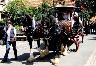 2007: Mehrere Tage lang feierte der MGV Marienhagen zusammen mit ungezählten Gastvereinen, den Einwohnern des Dorfes sowie den Gästen aus nah und fern in 2007 ein prächtiges Sängerfest in der Festscheune der Familie Klein. Zwei riesige Festzüge mit mehreren Kapellen zogen am Festsonntag und am „fröhlichen Montag“ bei idealem Wetter durch Marienhagens Straßen. Die Aufnahme entstand im Mittelweg und zeigt die stolzen Pferde vor der so wunderbar herausgeputzten Kutsche der Familien Döring aus Marienhagen und Zennern. Auf ihr durften die älteren Ehrenmitglieder des Männergesangvereins Platz nehmen. Im Hintergrund sind mehrere Sänger des MGV zu erkennen.