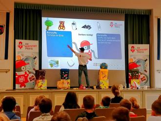 Den Kindern wurde der Unterschied zwischen Wertstoffen (Stoffe, die nach dem Gebrauch wiederverwertet werden) und Rohstoffen (Schätze der Erde) erläutert. Im Fokus stand das Sortieren von Abfall, um diesen in großen Teilen wiederzuverwerten. Ein Schritt, der im Alltag einfach umzusetzen ist und große Wirkung zeigt.