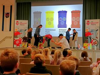 Ein Höhepunkt des Lerntheaters war ein Bau-Wettbewerb mit Legosteinen. Die Kinder lernten, dass klar getrennte Wertstoffe leichter wiederzuverwerten sind. Im Anschluss wurden die verschiedenen Mülltonnen und deren Inhaltsstoffe thematisiert. In einem spannenden Spiel auf der Bühne wurden Wertstoffe sortiert und anschließend vom Spielleiter beurteilt. Die Schülerschaft und die Lehrkräfte wurden immer wieder in das Geschehen eingebunden. Gegen Ende des Programms stand die Meeresverschmutzung durch Plastikmüll im Fokus und was man tun kann, damit weniger Plastik in die Umwelt gelangt.