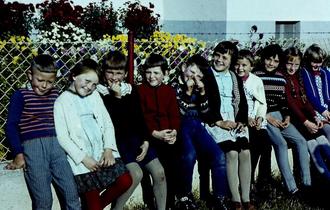 In der Mitte des vergangenen 20. Jahrhunderts entstanden diese beiden Fotos in Marienhagen. Die fröhlichen Volksschüler der Unterstufe sitzen auf dem Vorsprung der oberen Zaunmauer des modernen Spielplatzes an der Grenze zum noch sehr neuen Wohnhaus von Lina Wiesemann („Tante Lina“ und Hund Molly“) mit dem beliebten Laden der Metzgerei-Filiale Knipschild aus Herzhausen. Das Bild entstand um 1963 und zeigt zehn Kinder – acht Mädchen, zwei Jungen - der damals noch achtzügigen Volksschule Marienhagen während einer Pause. Lehrer war Karl Weisheit. An dieser Stelle befand sich bis 1959 der Hof Heinrich Gernandt, der in der Osternacht 1959 nahezu komplett abgebrannt war.