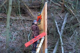 Als Zeichen, dass es in Hessens einzigem Nationalpark etwas Besonderes zu feiern gibt, hat sich die Nationalpark-Eule in Schale geworfen und trägt eine festliche rote Schleife. Sie wird das ganze Jahr über präsent sein und ziert unter anderem den Nationalpark-Wandkalender, die Jubiläumsseite im Veranstaltungskalender sowie alle Nationalpark-Eingänge.