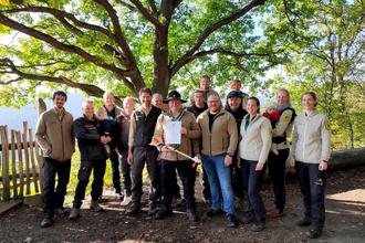 Feierstunde am Hagenstein: Uwe Schäfer (8.v.l.) blickte am 1. Oktober auf fünf Jahrzehnte Einsatz für die Natur zurück. Zu seinem Dienstjubiläum überreichte Nationalparkleiter Manuel Schweiger (6.v.l.) dem Jubilar die von Ministerpräsident Boris Rhein unterschriebene Urkunde. Bildautor: Inka Lücke