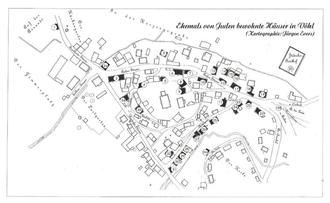 Der von Jürgen Evers geschaffene Ortsplan zeigt die früher von Juden bewohnten Häuser. Der Landkulturbote Noah Sach hat die Karte vergrößert auf eine Holzplatte übertragen und um die Namen der jüdischen Familien ergänzt. Diese Karte hängt nun im Flur der alten Synagoge und kann dort angesehen werden.