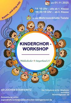 jugendreferentin@waldeckischer-saengerbund.de. Die Kinder erwartet ein abwechslungsreiches Programm angeleitet durch Jochen Stankewitz von der Landesmusikakademie Hessen. Ein Muss für alle singbegeisterten Kinder ab der 1. Klasse!