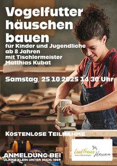 - Am Samstag, den 25.10. um 14:30 Uhr bieten wir für Kinder ab 8 Jahren mit Matthias Kubat in seiner Schreinerei an, Vogelfutterhäuschen selbst zu bauen. Anmeldung bei U. Klein (1069). Die Teilnahme ist kostenlos.