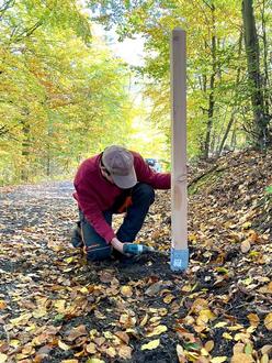 Rettungskette wird sichergestellt: Aufgrund der längeren Bauphase am Oberbecken Waldeck I installiert die Nationalparkverwaltung ein festes Läufersystem entlang der Umleitungen im Schutzgebiet. Die Holzpfosten enthalten neben dem Wegesymbol auch eine grüne Plakette mit dem Kürzel „NLP“ und einer 4-stelligen Nummer, die der Rettungsstelle im Notfall Auskunft über den Standort im Schutzgebiet gibt.