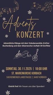 Zur Einstimmung auf die Adventsszeit laden die Gitarrengruppe „Auftakt 08“ aus Dorfitter und das Vokalensemble „d´aChor“ aus Buchenberg am 1. Advent (30.11.2025) um 18 Uhr in die St. Marien Kirche zu Korbach ein.