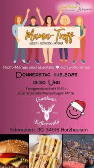 - Nächster Mama-Treff ist am Donnerstag, den 11.12. um 19:30 Uhr im Gasthaus Kellerwald in Herzhausen. Wir fahren in Fahrgemeinschaften um 19:15 Uhr ab der Bushaltestelle Mitte hin. Willkommen sind Mamas oder junge Frauen, die Lust haben, sich auszutauschen und einen netten Abend zu verbringen. Eine Anmeldung ist nicht erforderlich, wir haben einen Tisch reserviert.