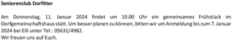 Am Donnerstag, 11. Januar 2024 findet um 10.00 Uhr ein gemeinsames Frühstück im Dorfgemeinschaftshaus statt. Um besser planen zu können, bitten wir um Anmeldung bis zum 7. Januar