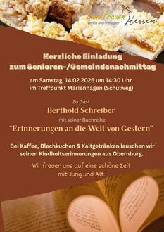 Wir laden alle Generationen aus Marienhagen zu einem gemütlichen Nachmittag im Treffpunkt am 14.02.2026 um 14:30 Uhr mit Berthold Schreiber aus Obernburg ein. Er stellt seine Bücherreihe „Erinnerungen an die Welt von Gestern“ vor und wir freuen uns auf seine Geschichten aus der Kindheit. Eine Anmeldung ist nicht erforderlich.