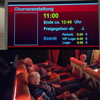 Zu einem Überraschungsausflug hatte der Vorstand der Klangfarben seine Sängerinnen und Sänger geladen. Ziel war das Kino in Wolfhagen. Dort war der Kinosaal ausschließlich für den Chor reserviert. Nach der Begrüßung mit einem Glas Sekt schauten sich die Sängerinnen und Sänger den Film „Fisherman‘s Friends“ an: