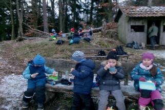 Als wir fertig waren und unsere Brotdosen leer, ging es weiter mit einem warmen Becher in der Hand, doch der Becher war nicht zum Wärmen da. Nein, denn es waren Tiere, die ein warmes Plätzchen suchten, um ihren Winterschlaf zu halten. Wir suchten den Bechern einen Platz, der für uns gut genug erschien um uns zu wärmen. Dies war gar nicht so einfach. Beim Temperatur messen vorher und nachher merkten wir sehr schnell, dass, wenn man sich aneinander kuschelt, einem viel wärmer ist.