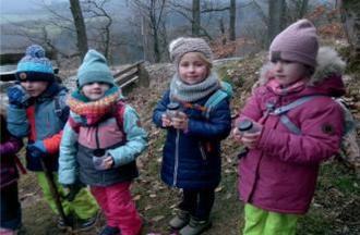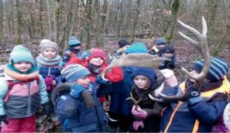 Am 7.2. war es endlich soweit. Die Rangerwanderung im Winter steht an. Wir starteten um 8.30 Uhr an der Kita, um uns am Parkplatz „Hochstein“ mit unserem Ranger Markus zu treffen. Wir waren schon sehr gespannt was er nun bei dieser Kälte mit uns machen will. Wir gingen ein paar Schritte in Richtung Wald und da ist uns schon einiges aufgefallen. Wir entdeckten Spuren!! Von welchem Tier die nur waren?? Wir verfolgten die Spuren und plötzlich lag dort ein Stück von einem Geweih. Ein paar Meter weiter fanden wir sogar Stücke von einem Fell und noch viele weitere Spuren die manche Tiere verloren hatten.
