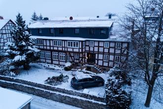 Im Schulweg 8 (früher 12) steht ein Fachwerkhaus, auf alten Postkarten kann man es noch bewundern oder man schaut es sich selber direkt einmal an, mit symmetrisch angeordneten Holzbalken, -riegeln und -streben, die Gefache meist mit Lehm-/Holzgeflecht ausgeputzt, das in seinem Ursprung zunächst aus einem Bauernhaus mit Stall und Scheune bestanden hat und im Laufe der Jahre mit einer Gastwirtschaft und Pension „Zum Grünen Kranze“ sowie einem kleinen Ladengeschäft erweitert wurde. Später avancierte es entsprechend der nationalen Zeit zum „Hotel Germania“, um in den 1960er Jahren zunächst als Landschulheim und in der heutigen Zeit als Wohnhaus genutzt zu werden.