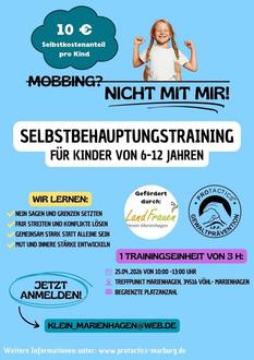 Am 25.04.2026 bieten wir im Treffpunkt von 10:00-13:00 Uhr ein Selbstbehauptungstraining für Kinder von 6-12 Jahren an. Teilnehmen können nicht nur Kinder von Landfrauen oder Marienhagener Kinder, sondern auch gerne aus anderen Orten. Pro Kind kostet die Teilnahme 10,00 €, die restlichen Kosten tragen die Landfrauen und sorgen außerdem für Snacks und Getränke. Die Plätze sind begrenzt, deswegen kann sich ab sofort bei unserer Vorsitzenden Ulrike Klein unter 05635/1069 oder klein_marienhagen@web.de angemeldet werden.