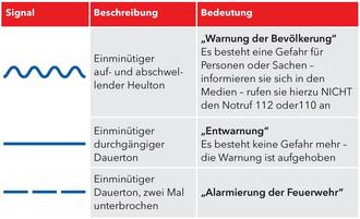 Hier ist die Bedeutung der Sirenensignale dargestellt. Beim Heulton "Warnung der Bevölkerung" sollten Sie umgehend das Radio einschalten und ihre Nachbarn über die Warnung informieren.