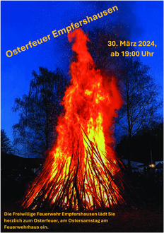 Die Freiwillige Feuerwehr Empfershausen lädt Sie herzlich am Ostersamstag zum Osterfeuer am Feuerwehrhaus Empfershausen ein.