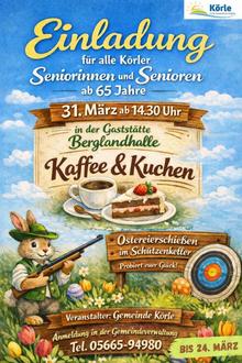 Die Gemeinde Körle lädt für Dienstag, 31. März, ab 14.30 Uhr, alle Seniorinnen und Senioren ab 65 Jahre zum gemeinsamen Kaffeetrinken mit Ostereierschießen in die Berglandhalle ein.