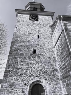 An den Schießscharten im Turm und der Kirchenmauer wird die frühere Funktion eines Wehrturms deutlich.