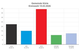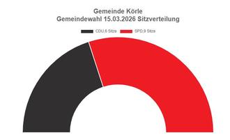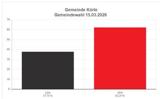 Die SPD bleibt in Körle stärkste Kraft. Bei der Kommunalwahl am 15. März sicherte sich die SPD Körle 62,25 Prozent der Stimmen und legte damit im Vergleich zur Kommunalwahl vor fünf Jahren um mehr als zwei Prozentpunkte zu. Die CDU kommt auf 37,75 Prozent. Damit bleibt es im Körler Parlament bei der derzeitigen Sitzverteilung: SPD 9 Sitze, CDU 6 Sitze.